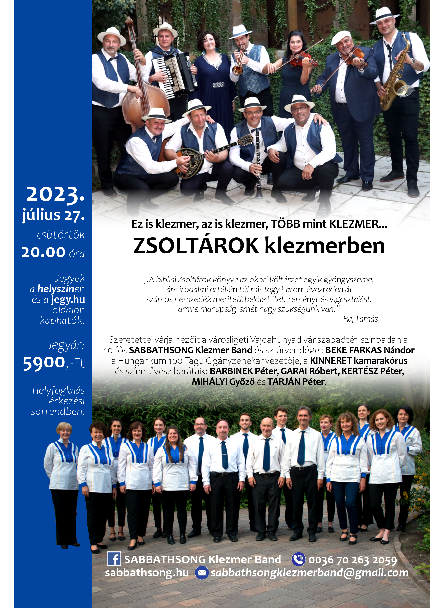 Szeretettel várja nézőit a városligeti Vajdahunyad vár szabadtéri színpadán a 10 fős SABBATHSONG Klezmer Band és sztárvendégei: BEKE FARKAS Nándor a Hungarikum 100 Tagú Cigányzenekar vezetője, a KINNERET kamarakórus és színművész barátaik: BARBINEK Péter, GARAI Róbert, KERTÉSZ Péter, MIHÁLYI Győző és TARJÁN Péter.